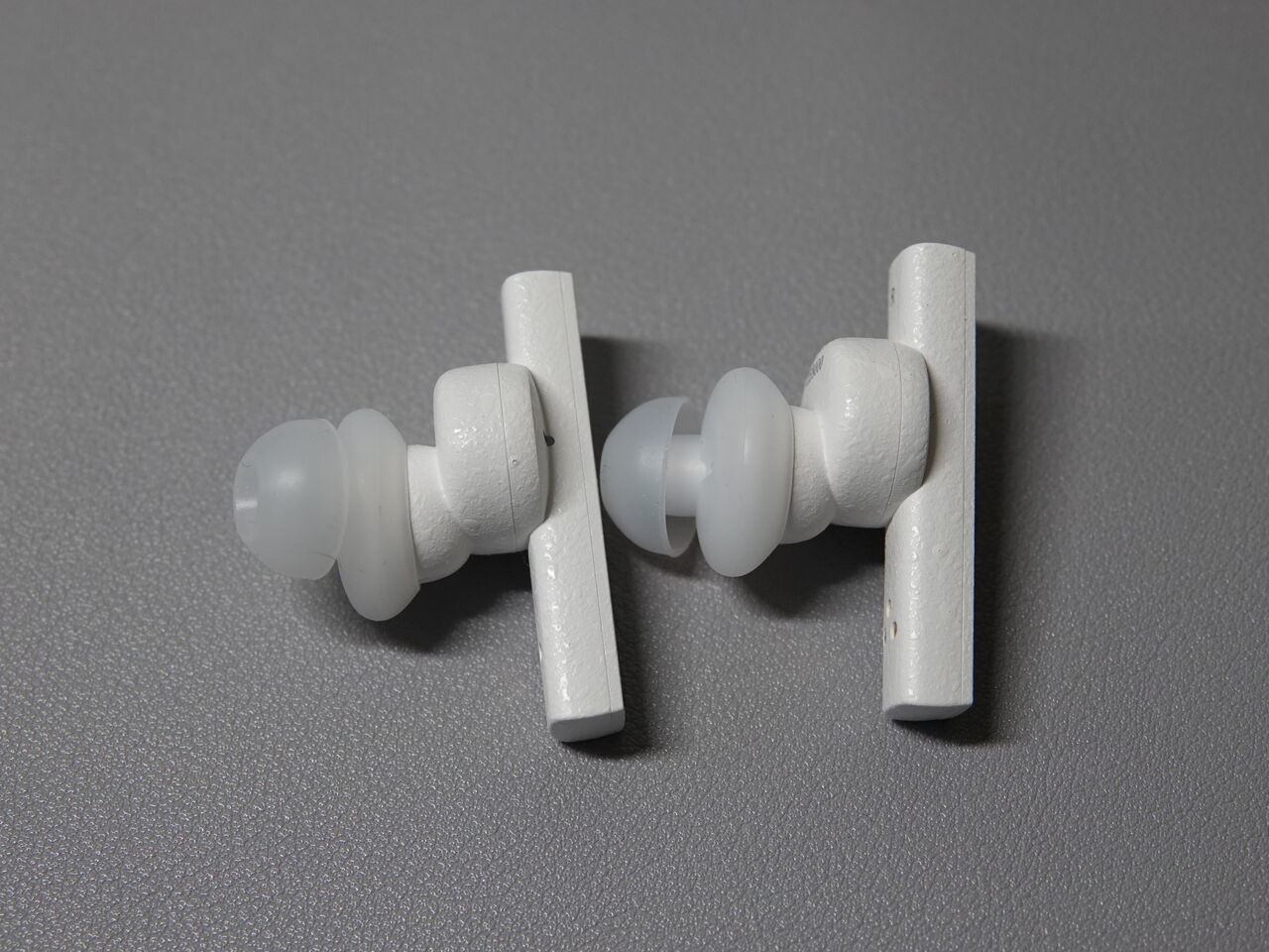 2、装着感はかなりシビア。個人的には3枚目のように同社のTWS用のイヤピを付けたほうが付けやすい。装着がシビアなのにイヤホンの棒の部分にタッチセンサーがあるので誤作動もしやすく使いにくい。